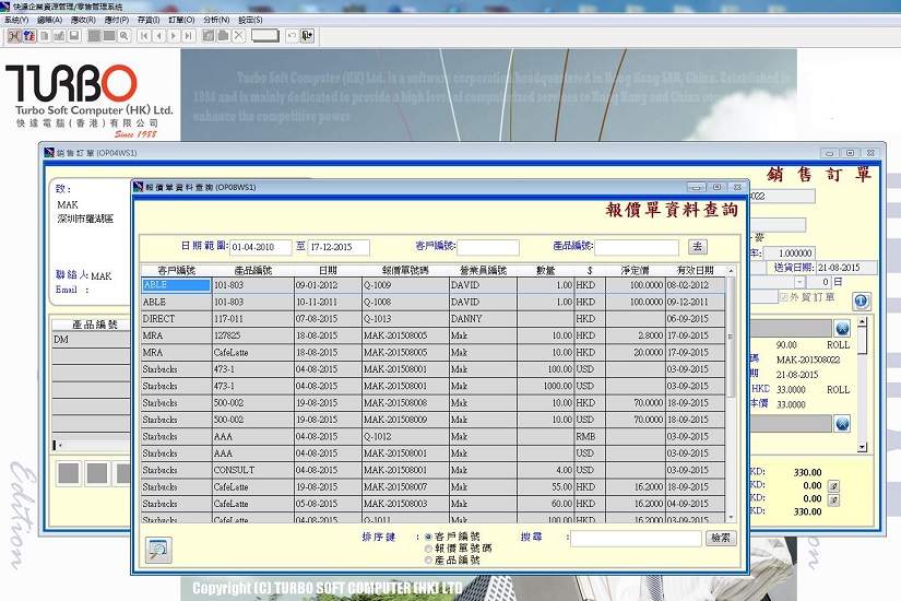 .多层次式搜索订单查询功能,让用户更清楚地查阅客户所有之报价单、订单欠数、货运船期及其它数据。